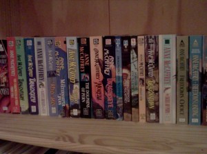 As you can see, I have quite a few of her books. I mostly read her Dragonriders of Pern series, which are still some of my favorites. I especially loved the ones set in Harper Hall. The Harpers of Pern were sort of like bards – they learned Teaching Ballads (and created new ones) and then were sent out to other holds to teach the people their history through song. When I first read these books, I wanted nothing more than to be a Harper. I wanted to live in Harper Hall and write music and poems to send out to the people. The Masterharper of Pern is probably my favorite book of the Dragonriders series.