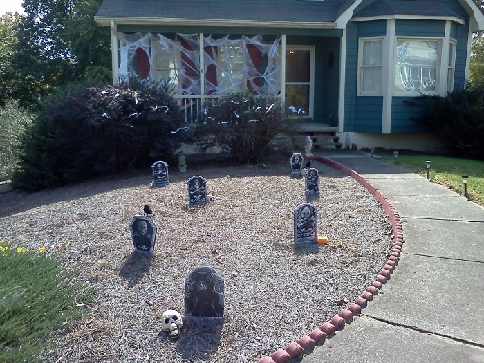 So what to blog about? This weekend, my daughter and I got our house ready for Halloween. We have been hitting the dollar store like crazy and found quite a bit of stuff.Ā Our front yard is now a spooky graveyard, with skulls scattered around and ravens perched on tombstones. We also cobwebbed our front porch, which was not as easy as I thought it was going to be.