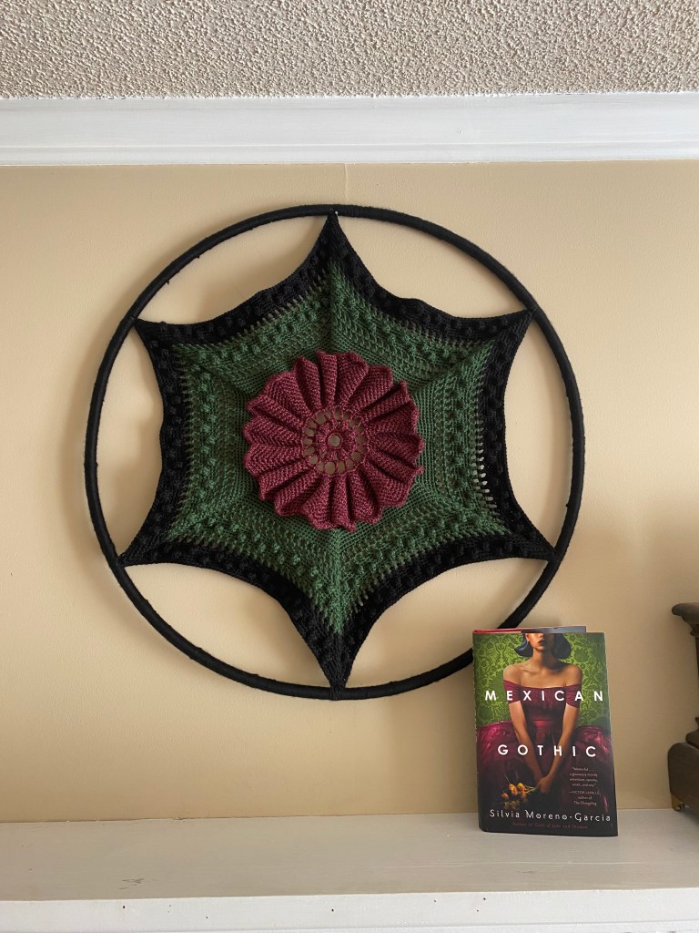I’m very excited about this one, even if it turned out nothing like I thought it would. Please meet my newest crochet project, inspired by the cover art for Mexican Gothic by Silvia Moreno-Garcia.