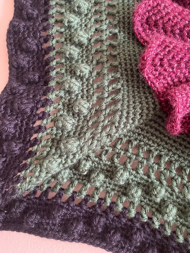 This one was a challenge on multiple fronts. First off, I’ve never attached anything to a hoop before, but I wasn’t sure what else to do with it. I loved the pattern from the moment I saw the picture, but I didn’t realize it would get this big. I thought it would be a small hexagon that I could replicate, join together, and make another scarf with. When it started getting too big for that, I thought about making two hexagons and then attaching them together to make a purse or tote bag. Still way too big!