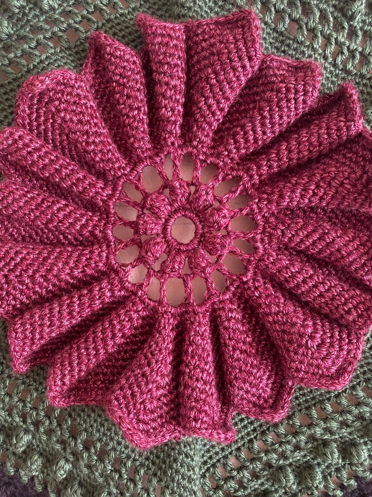 I may do something else with the hoop other than wrapping it in yarn – that’s the only part of this I didn’t really like. I love the colors and how the pattern turned out. Not only that, but this has led me to a new website (through Pinterest, because of course it did) that I have completely fallen in love with called Free Vintage Crochet. This website has scans and typed out patterns from old magazines – hundreds of them, with new ones added all the time. This pattern is the Sunflower Popcorn Bedspread pattern – yes, these were supposed to be granny squares (granny hexagons?) to make an heirloom bedspread. I don’t think they were supposed to be quite this big – maybe my yarn was just thicker than what the pattern intended. Still, it’s a really cool pattern and the site is amazing. I will definitely be looking for more patterns here!