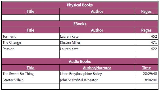 Starter Villain was a last minute read – my husband and I listened to it on a road trip. I also started Passion by Lauren Kate, but unfortunately did not finish it by the end of the month. It will go on next month’s tally.