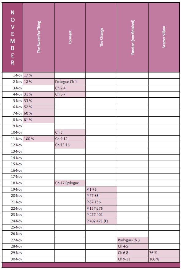 November was a crazy month. My work load at my job tends to triple (and sometimes quadruple) during November each year, and this year was no exception – in fact, it was worse since I was helping out in other areas during the work day. It didn’t leave much time for reading or blogging, but let’s take a look and see what I did accomplish.