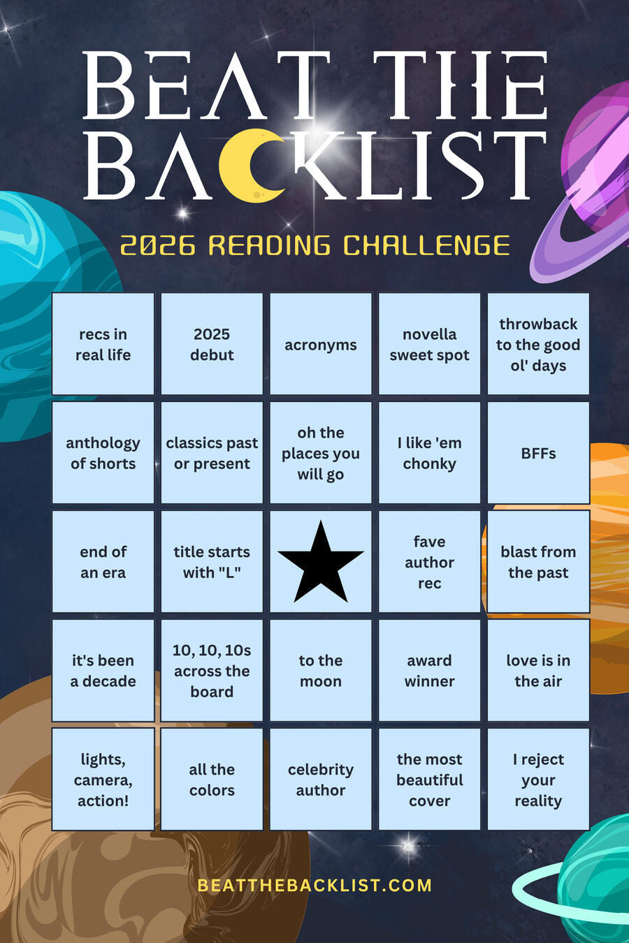 Bringing back Beat the Backlist to try and whittle down my ever growing TBR. I don’t think I’m going to shoot for a specific number, but one of the things they created was a bingo card with reading prompts. So I will be going for at least a few bingos on that. Here’s the card: